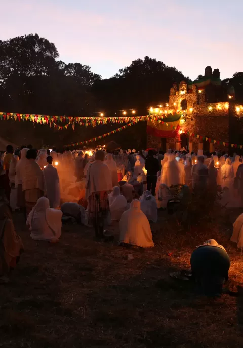 Otherwise known as the Feast of Epiphany for the Ethiopian Orthodox Church, Timket is celebrated on January 19th just two weeks after the celebration of Christmas. The origin of this feast dates back over 1000 years and is now one of the country's largest festivals and commemorates the baptism of Jesus in the Jordan River. The festival typically last for 3 days long and begins on the eve of Timket with a reenactment of the baptism. This night the Priests bring out the Tabots which are two replicas of Moses' tablets purportedly housed in the Arc of the Covenant and are rarely seen by the people. In the very early morning (around 2 AM), the priests bless the water of the pool or river where the celebration will take place the next day. Visitors can witness this ceremony which is lost on most of the world and given extreme reverence. The festival is best observed in Gondar, where the crowds gather at Fasilides' Bath inside of Fasil Ghebi. Many dances and songs are performed by those attending, and most locals are dressed up in their finest clothes.