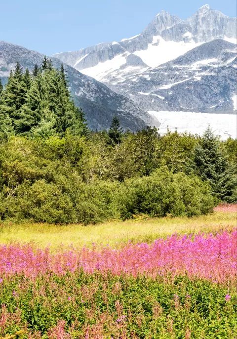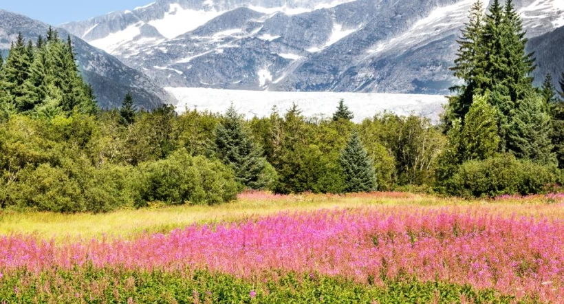 Mendenhall Glacier and field of Fireweed in Juneau, Alaska