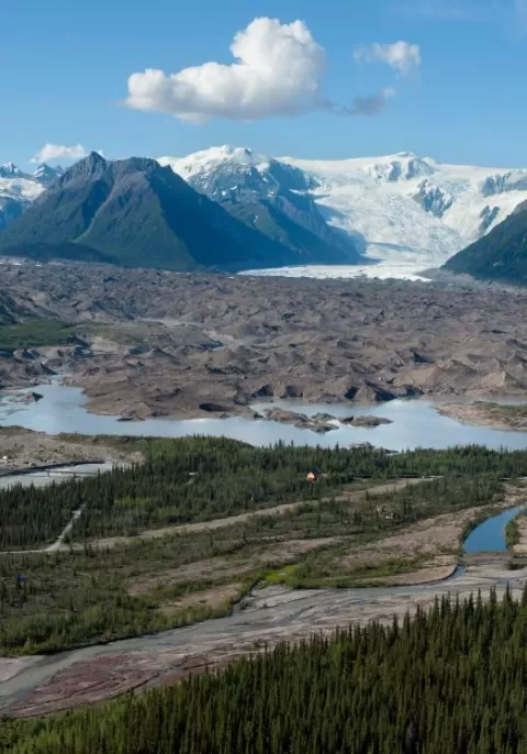Discover Wrangell St. Elias National Park & Preserve, the largest national park in the U.S., with an area of over 13 million acres ( 20,000 square miles), larger than Yellowstone and Yosemite combined. Located about 160 miles east of Anchorage and on the edge of Denali National Park, the park encompasses four mountain ranges, six of North America's largest glaciers, two active volcanoes, three major rivers, and countless lakes and streams with no roads other than McCarthy and Nabesna. From hiking some of Alaska's most spectacular trails to paddling through beautiful ice-blue glacier lakes, watching grizzly bears and moose in their natural habitats, or taking a bush plane ride over Root Glacier, there is no shortage of activities to enjoy when you take an Alaskan vacation with us. Contact us today to plan your Wrangell St. Elias National Park adventure.