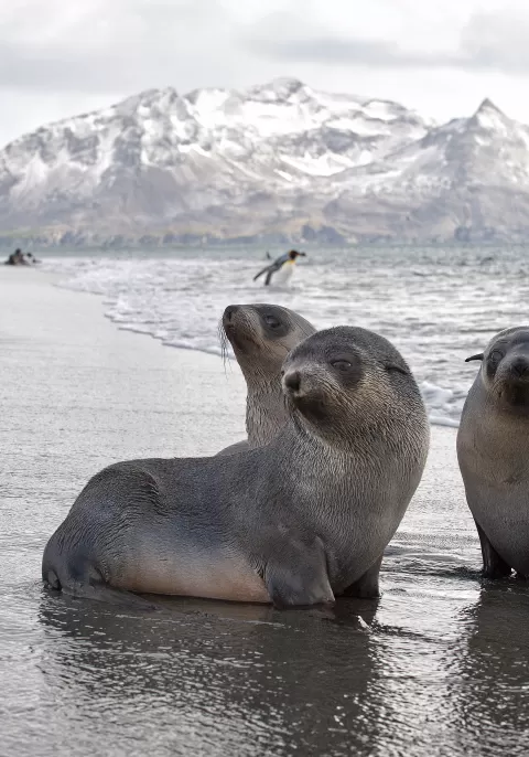 The ice-coated Antarctic Peninsula forms perhaps the most accessible region of mainland Antarctica, lying a mere 480 miles away from South America across the fabled waters of Drake Passage. Lying close to the northwestern tip of the Antarctic Peninsula, separated by the Bransfield Strait, the South Shetland Islands fall under the jurisdiction of the Antarctic Treaty, suspending claims on their sovereignty. Several countries maintain research bases here, and with plump elephant seals and crowds of Gentoo, Chinstrap, and Adelie Penguins also calling the islands home, it can even feel a little crowded at times. King George Island is the largest and most hospitable island, hosting the majority of the research stations, some of which are populated all-year-round by tiny, hardy crews. Don’t be fooled, though; these islands offer extraordinary adventure in one of the most remote locations on earth. The triple peaks of Mount Foster tower above the archipelago, and you can feel your heart pumping a little quicker as you sail into the core of Deception Island’s magnificent collapsed volcano caldera. Hike the Luna landscapes within and even dip into the improbably warm, geothermally heated waters of Pendulum Cove. Elephant Island, meanwhile, is written deep into the annals of Antarctic expedition legend.