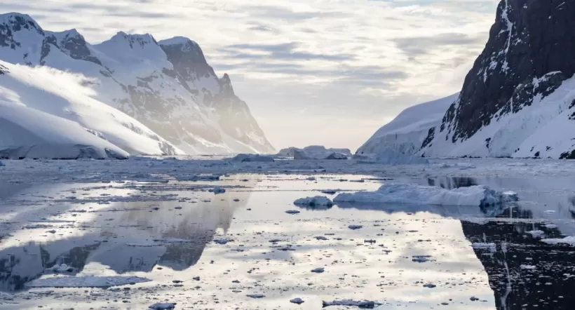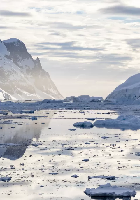 Navigate Lemaire Channel, framed by cliffs and glowing blue ice