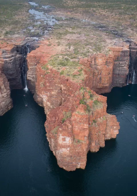 The journey up the King George River is nothing short of breathtaking. The 80m high sides of the gorge display varying degrees of weathering of the ancient Warton sandstone. The colors and textures of the gorge change with the light as you travel further up the river creating a continually changing scenery that is simply stunning. The journey culminates at the King George twin falls; the highest single-drop falls in the whole of the Kimberley (80m or 260ft). Fed by wet season run-off the level of water cascading over the falls varies from year to year. The Expedition Team escorts you in either the Zodiacs or ship tenders to the foot of the twin falls and explains all about the stunning geological formations of the canyon.