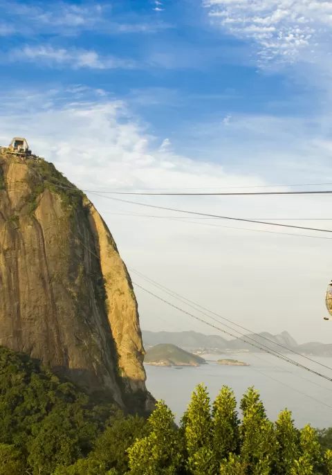 Sugarloaf Mountain got its name from Portuguese sailors who felt the granite monoliths resembled a traditional block of sugar. Today's Rio de Janeiro tour gives a different perspective of the city, and you and your guide will take the cable cars that climb to the top of Sugarloaf Mountain. From the peak, the entire cidade maravilhosa (marvelous city), coastline, and the Atlantic Ocean spread out below you. Descend by cable car and do a driving tour of Rio de Janeiro's city center to see the famous Sambadrome, the Teatro Municipal, and the modern-styled Cathedral. Please note that this half-day excursion can be arranged on any day and is a good option in the evenings to enjoy the sunset over Copacabana Beach. The remainder of your day is free to relax, take in the sights of Rio's beaches, or for an optional excursion during this custom Brazil tour.