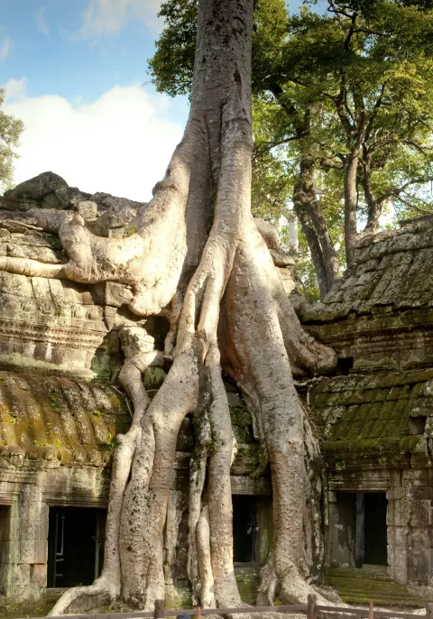 Start with a visit to Angkor Thom and take an optional walk along the wall to another hidden temple in the jungle. Next visit the temple of Bayon whose 54 towers represented the 54 provinces of the Great Khmer Empire. Enjoy lunch at Chanrey Tree restaurant. After lunch, visit the temple of Ta Phrom. built in the mid 12th to early 13th centuries. Ta Prohm was largely left as it was found, with overgrown jungle trees and vines causing many parts of the temple to crumble to the ground. The picturesque ruins very much live up to their portrayal in the film Tomb Raider.