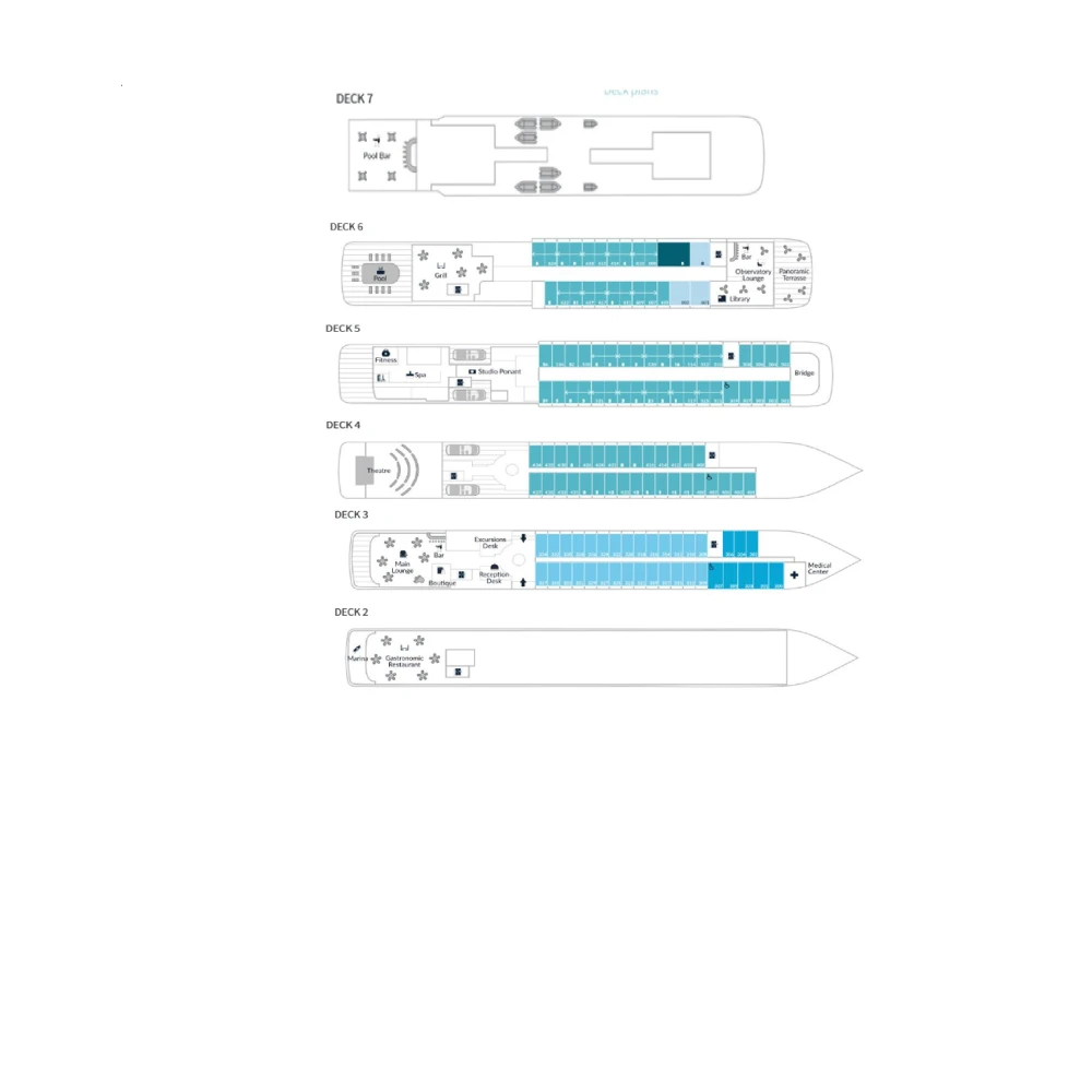 Across its five decks, Le Soleal offers a variety of social and leisure spaces designed for relaxation and enjoyment. Guests can savor fine cuisine at two gourmet restaurants, unwind at the full-service bar, or relax in the lounges. The ship also features a spa, fitness center, and swimming pool, while the panoramic terrace on the upper deck provides stunning views of the surrounding landscapes and seascapes.