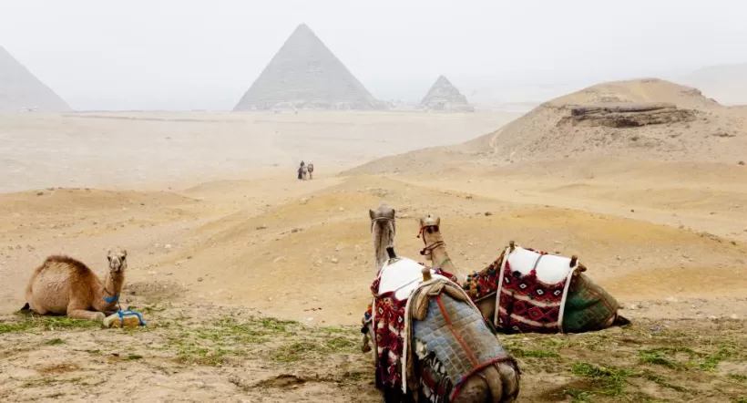A group of camels rests in front of the Giza pyramids
