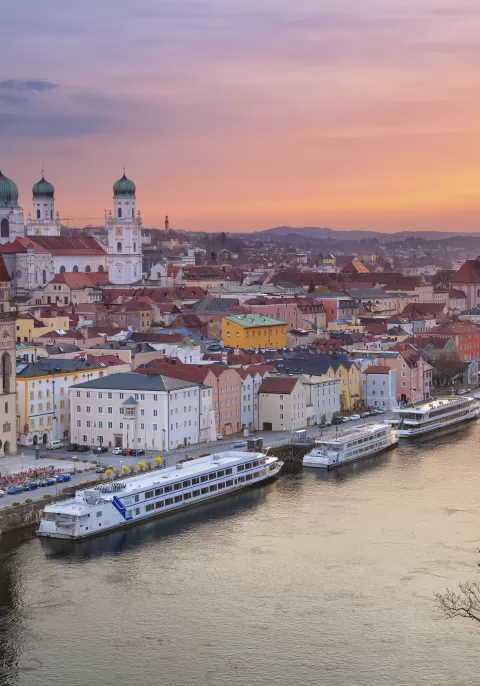 Founded by the Celts over 2,000 years ago, Passau is one of Bavaria’s oldest cities. Known as the “City of Three Rivers,” it rests at the confluence of the Inn, Ilz and Danube rivers. The city has long enjoyed its strategic position and grew to great economic and political power because of it. The legacy of its past prosperity lives on in graceful arcades, colorful houses with rococo facades and the glorious baroque St. Stephen’s Cathedral, home to one of Europe’s largest pipe organs. Passau is also where two nations meet; it is here that the German-Austrian border begins.