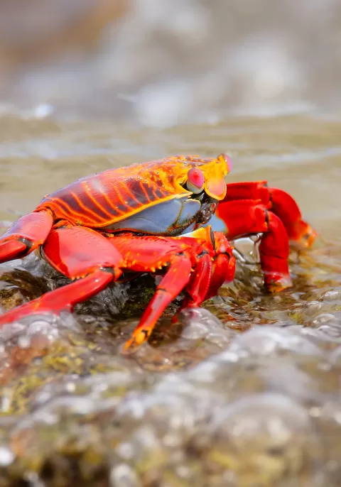 At Puerto Egas, black sand beaches and lava tide pools are home to Galápagos fur seals, Sally Lightfoot crabs, and hunting herons.