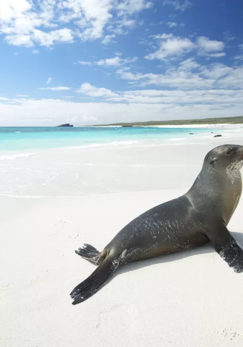 Mosquera islet is a small, flat, sandy islet located between Baltra and North Seymour islands. With no fixed trail, you are free to explore the beautiful surroundings on foot, where you will encounter a large population of sea lions, shorebirds, and the striking Sally Lightfoot crabs that cling to the dark rocks. The numerous coral reefs also make it a fantastic site for snorkeling and catching sight of a range of marine life including sharks, turtles, and rays.