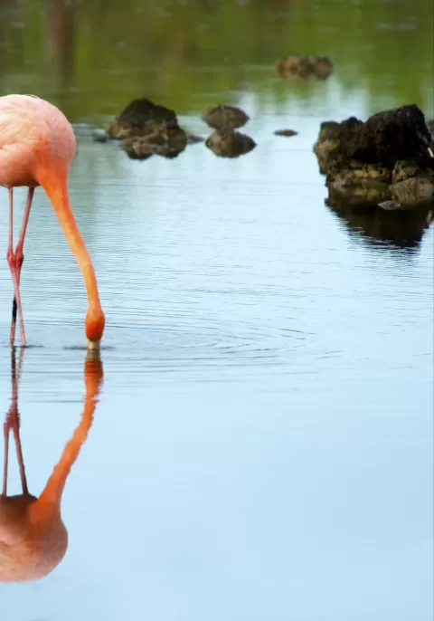 Highlights: American flamingo, blue-footed booby, frigatebirds, tropicbirds, Galapagos shearwaters, sea lions, sea turtle nesting site, finches, shorebirds, coral-sand beach.