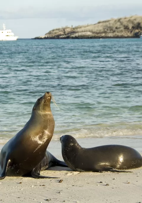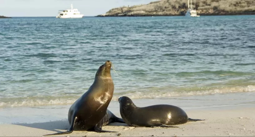 Venture to Lobos Island, a tranquil islet secluded from San Cristobal by a slim channel. This nature's cradle, amidst a serene bay, is the playground for sea lion pups frolicking in tidal pools. The island might be modest but bursts with life, particularly with "lobos marinos" or sea lions. As you step ashore, welcoming committees of sea lions would greet you, only to be outraged by the male frigatebirds inland, presenting their inflamed red balloons amidst the verdant foliage. Stay vigilant for the blue-footed boobies nesting on the trails, ready to treat you to a display of their whimsical courtship dance.