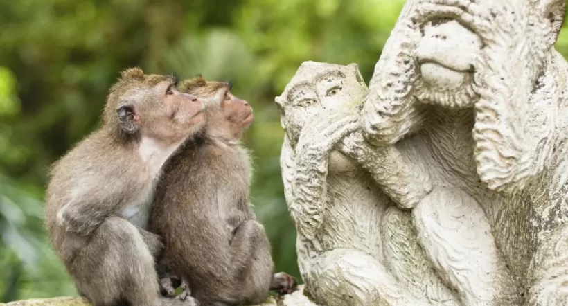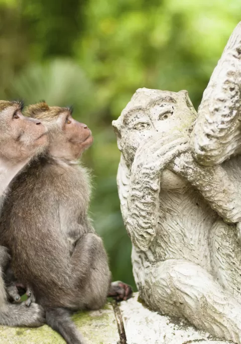 Two monkeys admire the statues