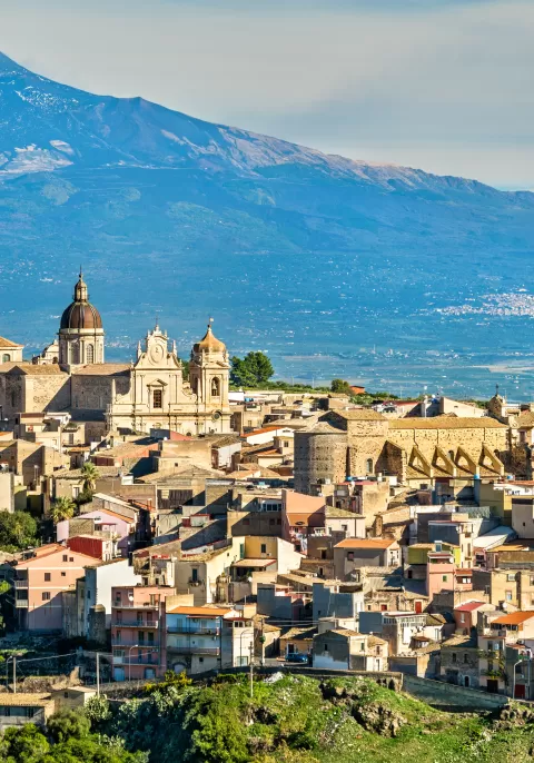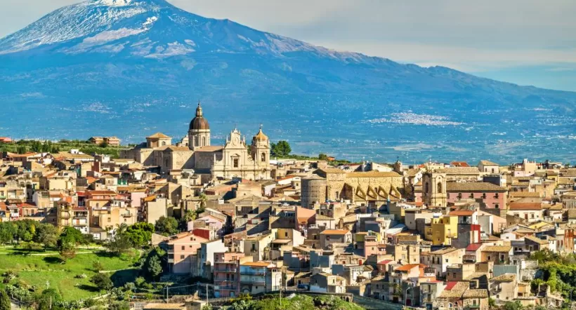 Mount Etna looms over an ancient town