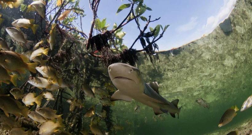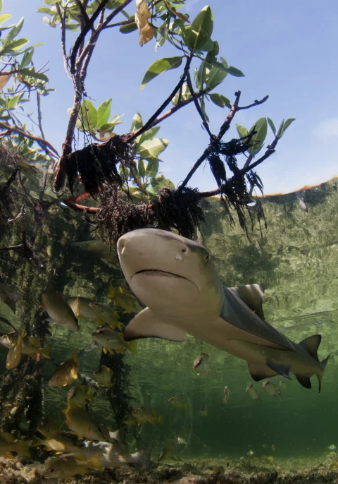 Baby lemon shark with fish in mangrove forest