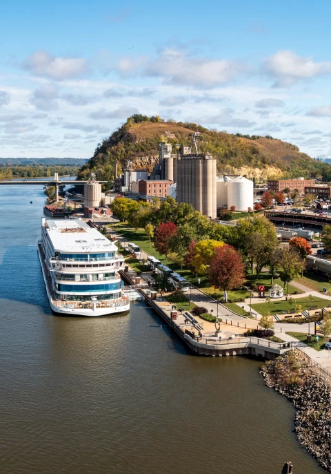 Aerial view of Red Wing, Minnesota with river cruise boat in harbor